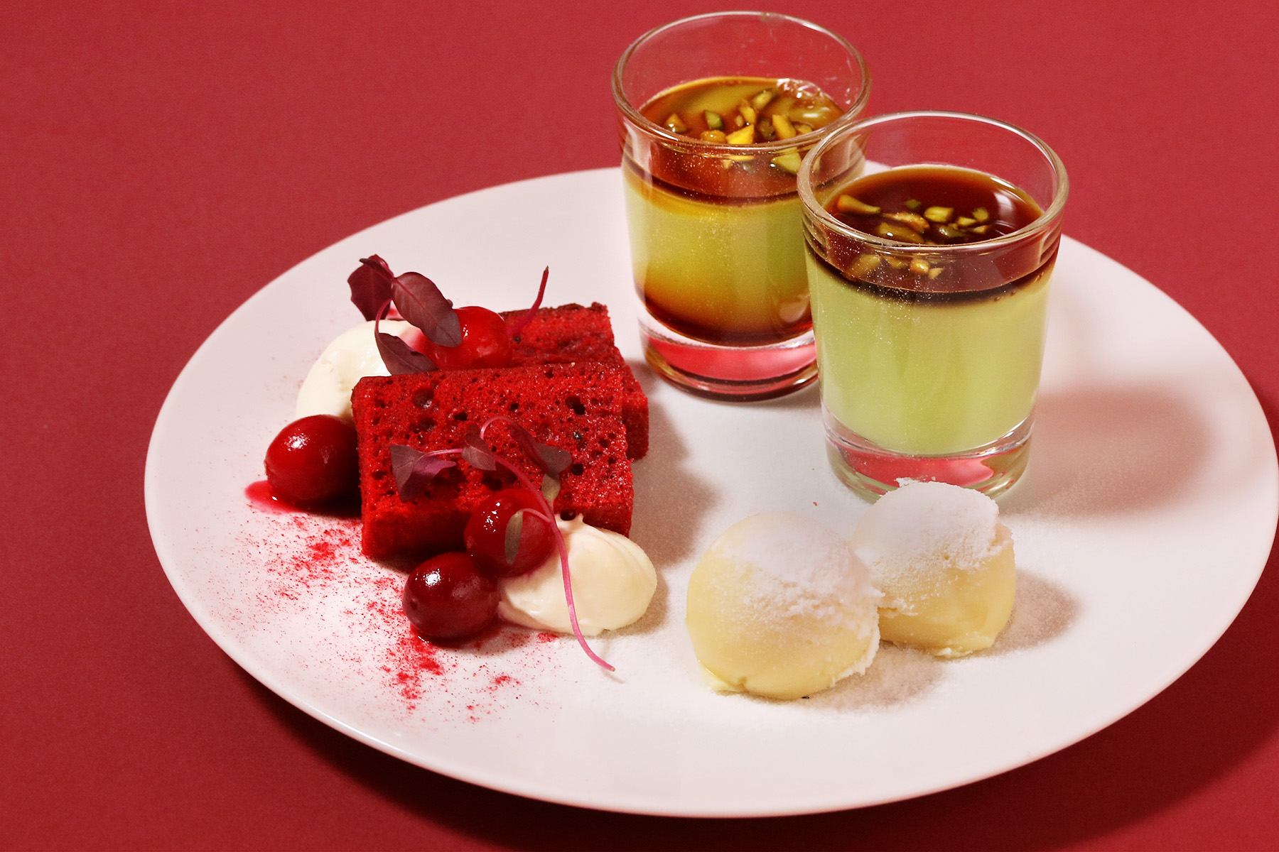 1st Plateは、苺やチェリー、ピスタチオといった素材それぞれの持ち味を異なる菓子で表現した構成です。瑞々しい果実の赤、まろやかな白、香ばしい緑が重なり、味わいのコントラストとして広がります。