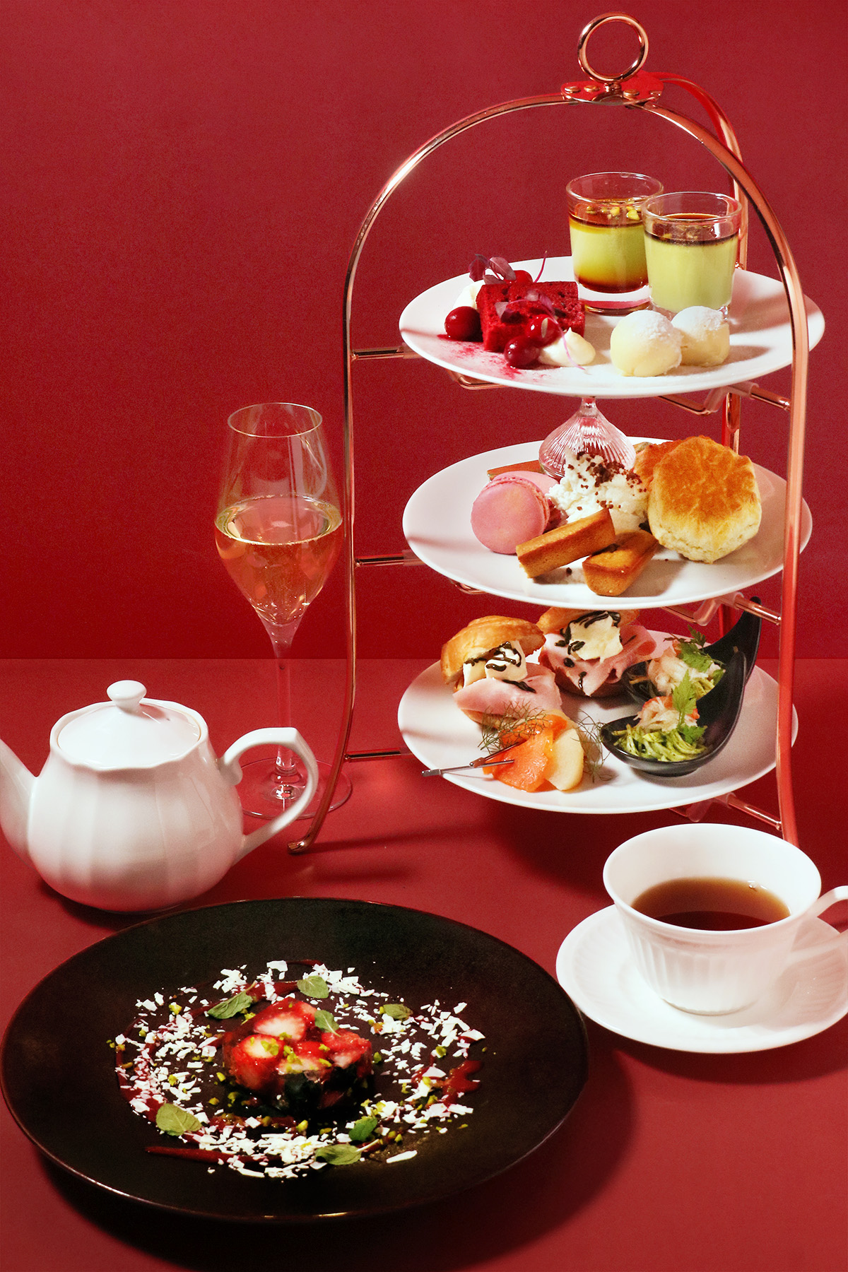 三色の彩りと旬の素材を、スイーツとセイボリーの構成でバランスよく散りばめ、冬のご褒美にふさわしいアフタヌーンティーに仕上がりました。