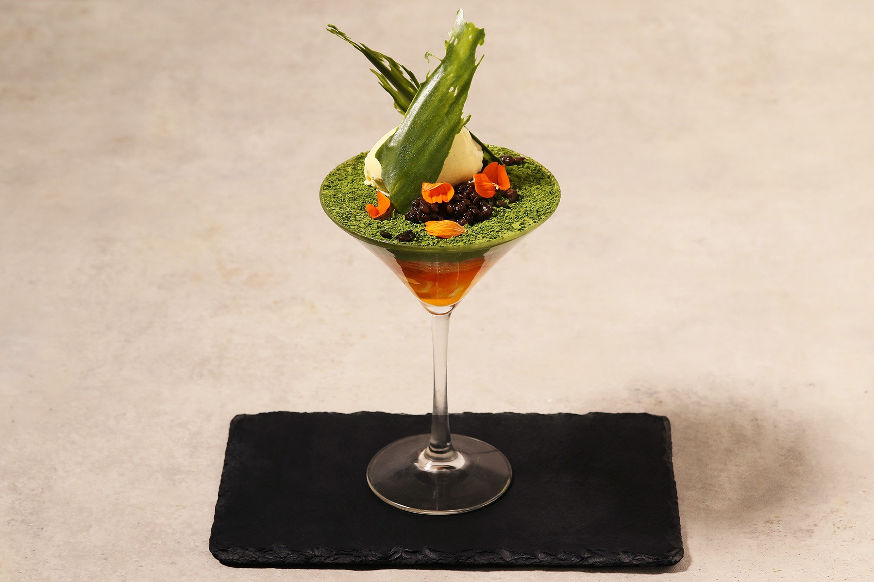 「新版画」をテーマに“和”の素材として人気の抹茶を中心に構成しました。パフェに添えた抹茶チョコレートは、版画制作の「刷り跡」や「重なり」をイメージ。鮮やかな抹茶の緑に映えるオレンジは、本展のテーマカラー“夕焼けオレンジ”でもあります。軽やかな味わいのソースで、最後まで飽きずに楽しめます。