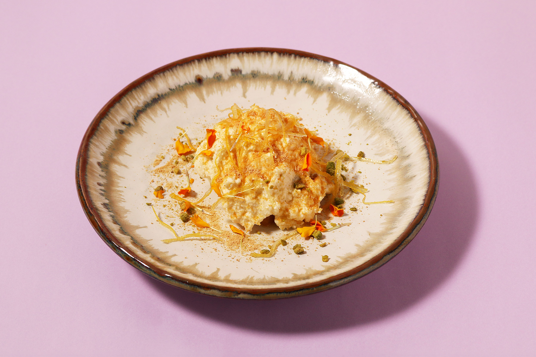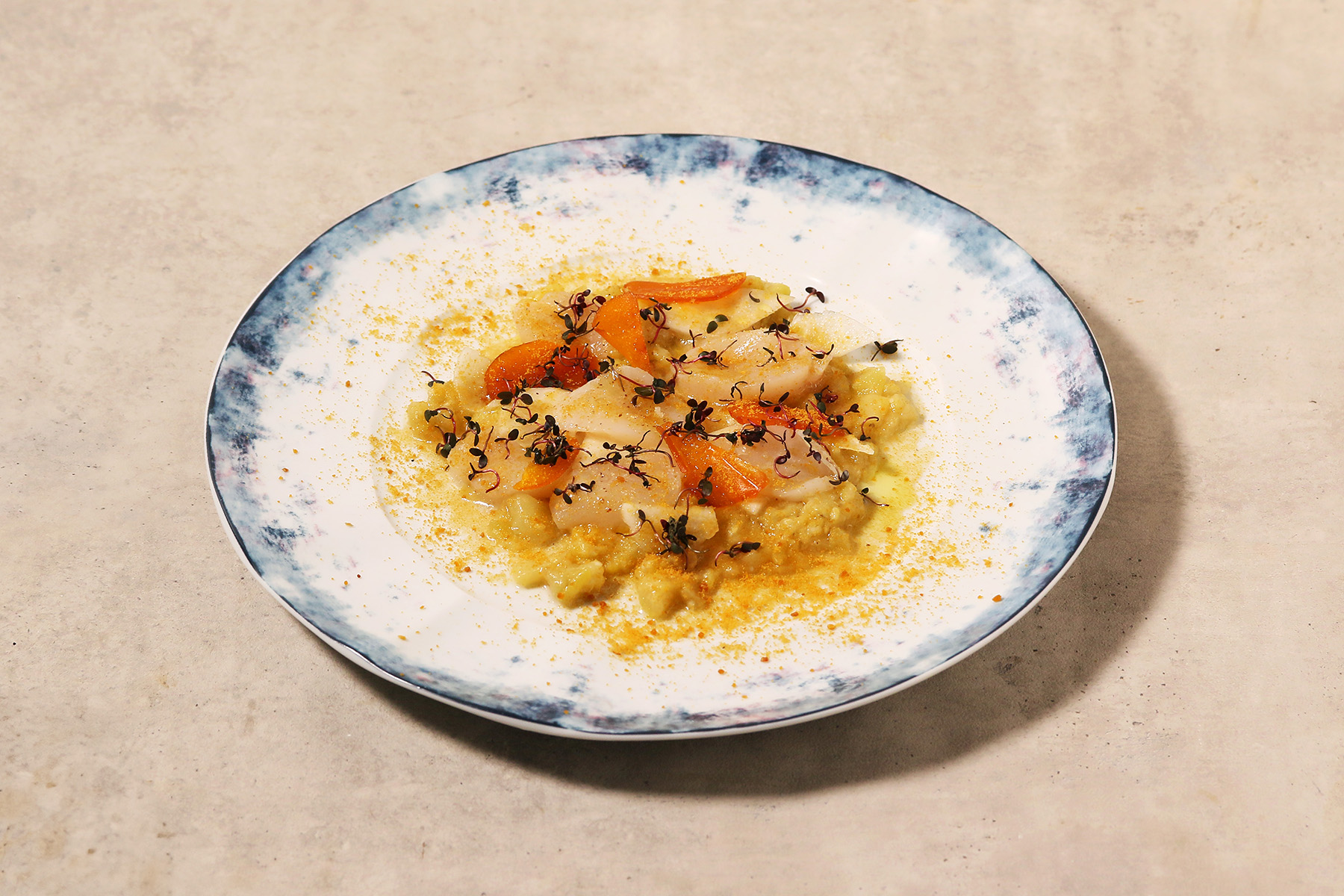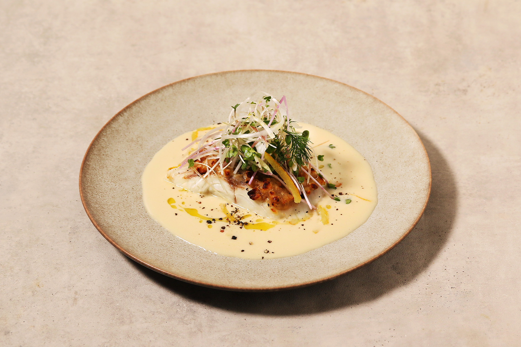 親しみのある「西京焼き」を再解釈した一皿です。柚子の香り豊かなソースには白みそを隠し味に加えています。シャキシャキとしたスプラウトとオレンジピールが味わいに奥行きをもたらします。