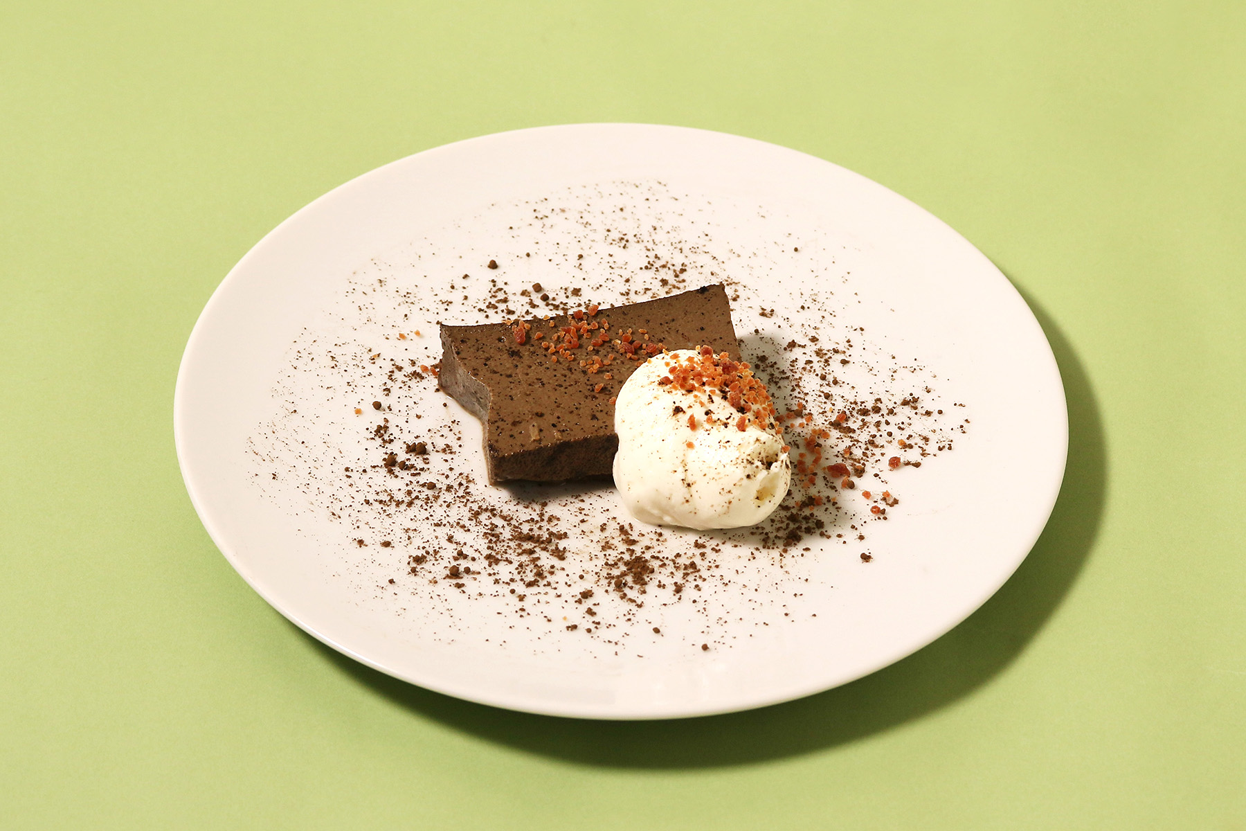 ほうじ茶を用いて和のニュアンスを取り入れた、固めのプリンです。アクセントにはフロマージュチーズのクリームを添え、味の変化も感じていただけます。