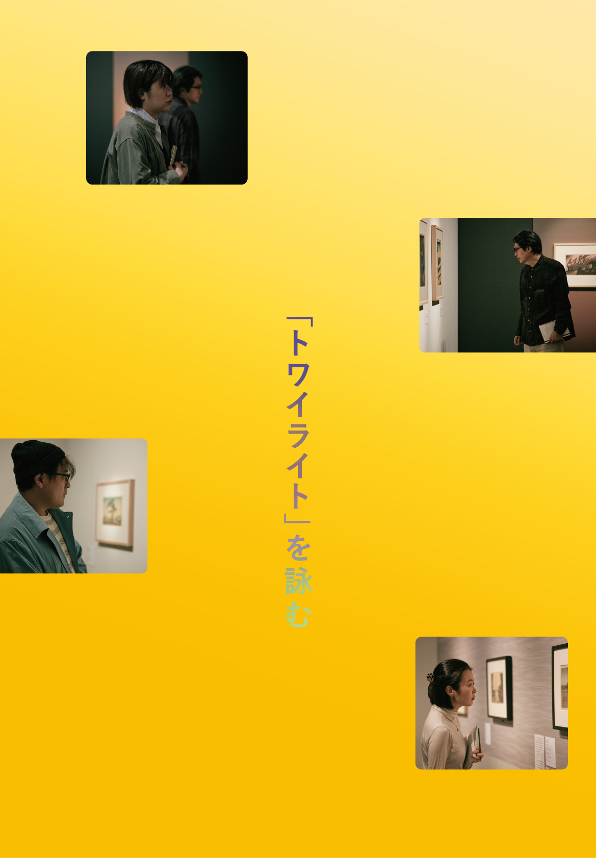 四名の歌人(穂村弘さん、岡野大嗣さん、岡本真帆さん、小原奈実さん)が「トワイライト、新版画」展を鑑賞し、各自一首ずつ歌を詠んでいただくという試みを通して、展覧会の新しい楽しみ方をご提案いたします。