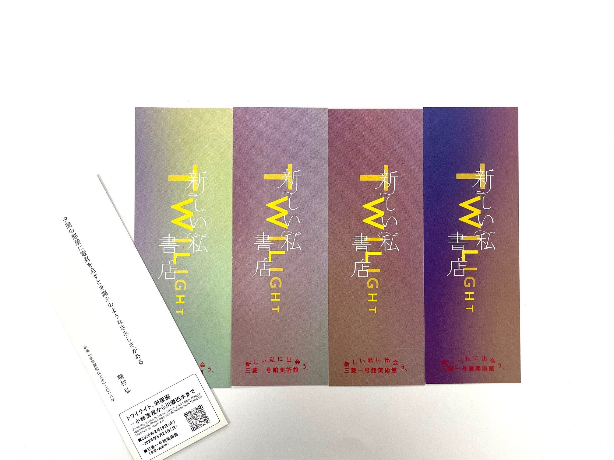 穂村弘さんに、本展の出品作品と同時代に黄昏時を詠んだ短歌を選定いただき、その歌を記したオリジナルのしおりを作成しました。書店等で配布中です。 4色揃うとトワイライトなグラデーションが楽しめます。短歌を通して当時の情景を想像できる企画です。 ※無くなり次第終了。