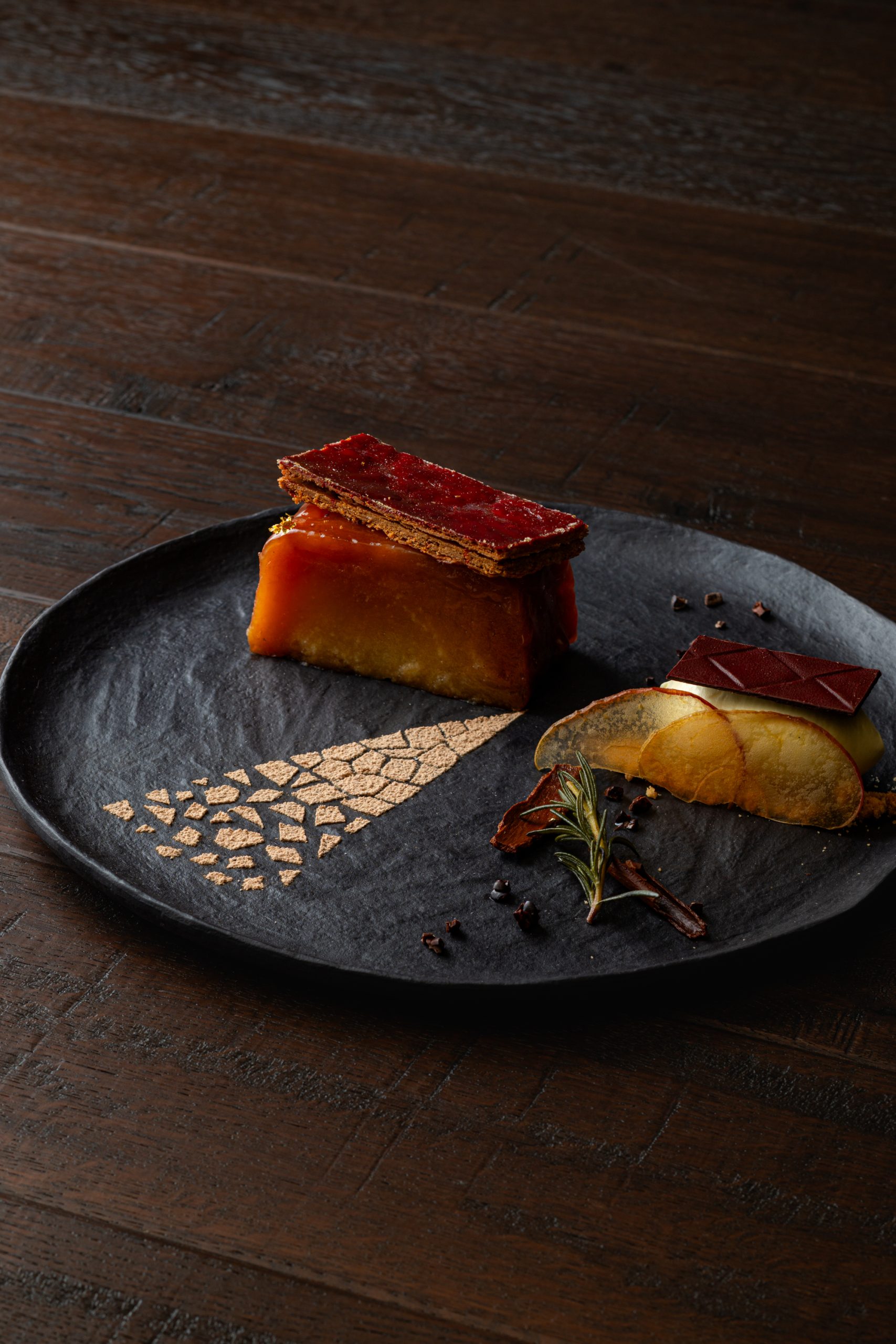 日本の漆芸を学んだ工芸家ジャン・デュナンは漆を金属に塗布するなど、斬新なアイデアで制作したコンパクトやバックルなどを、フランスの伝統菓子タルト・タタンでオマージュしたデザー卜です。